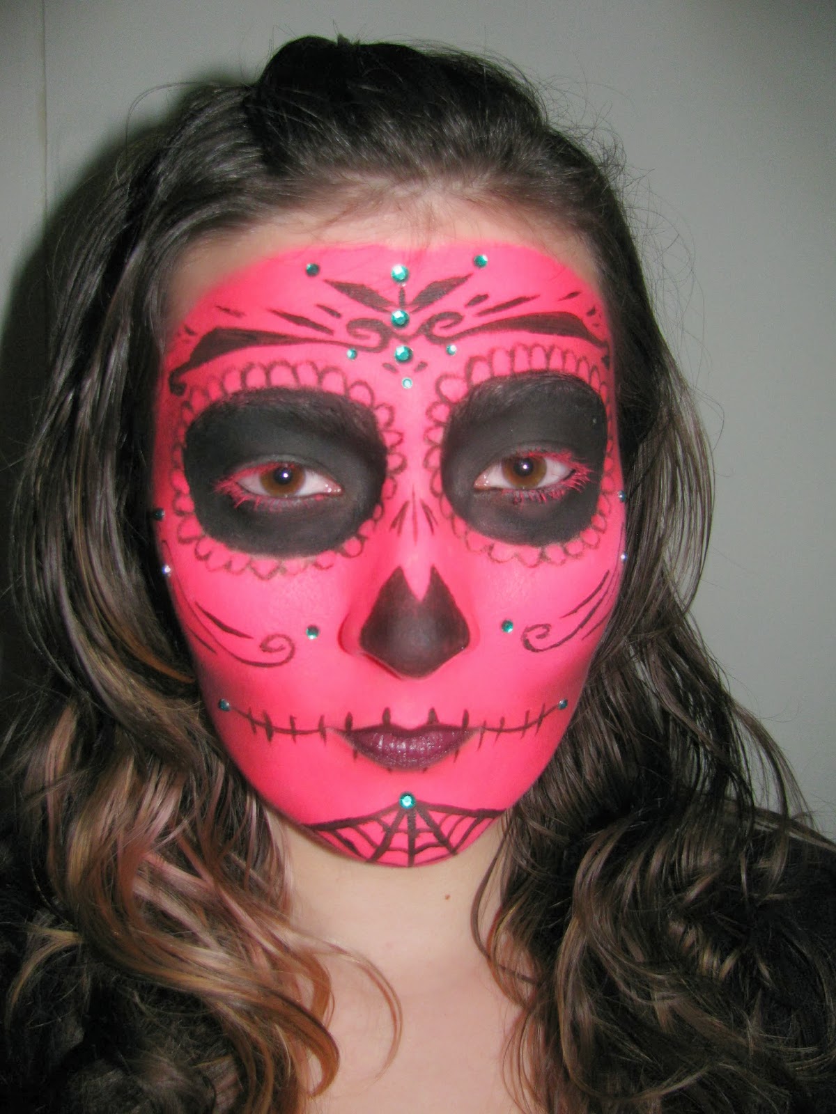After my delicious dinner of spinach and bacon pasta, I continued with drawing designs on my face. When I thought it looked good enough, I took a lip brush and used that to clean up all the edges with the aquacolour. I then used a package of green gems in various sizes and glued them to my face with lash glue anywhere I wanted. I also took a flat liner brush and dipped that in water and made a much thinner consistency paste with the Kryolan Aquacolour. I ran that brush all along my lashes so that they would be hot pink too. This product is not technically meant for use around the eyes, so I am not necessarily recommending you do this, but I like to live dangerously.